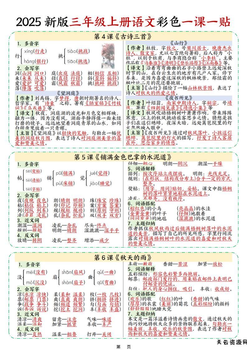 25新三上语文彩色一课一贴(9页)-天云资源网