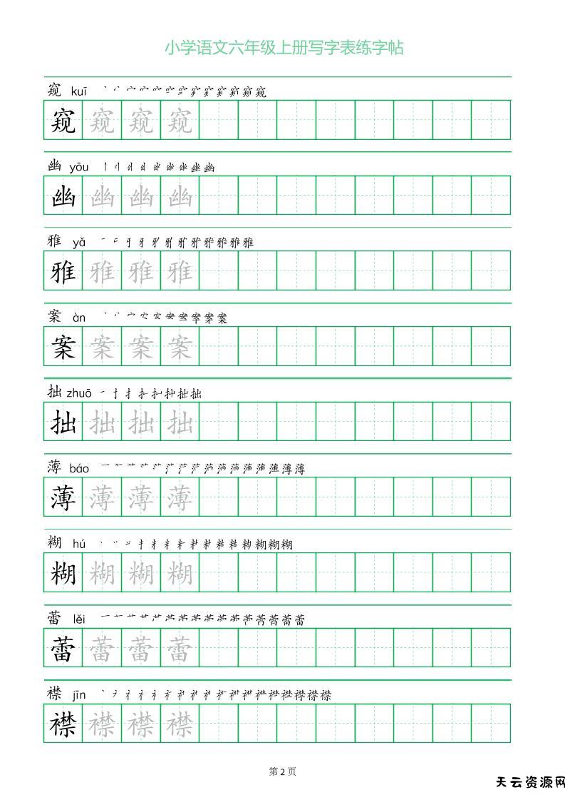 六年级语文上册一字三描红写字表字帖-天云资源网