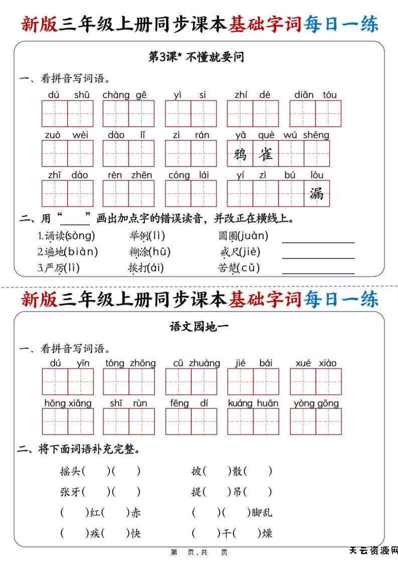 25新三上语文同步课本基础字词每日一练(含答案19页)-天云资源网