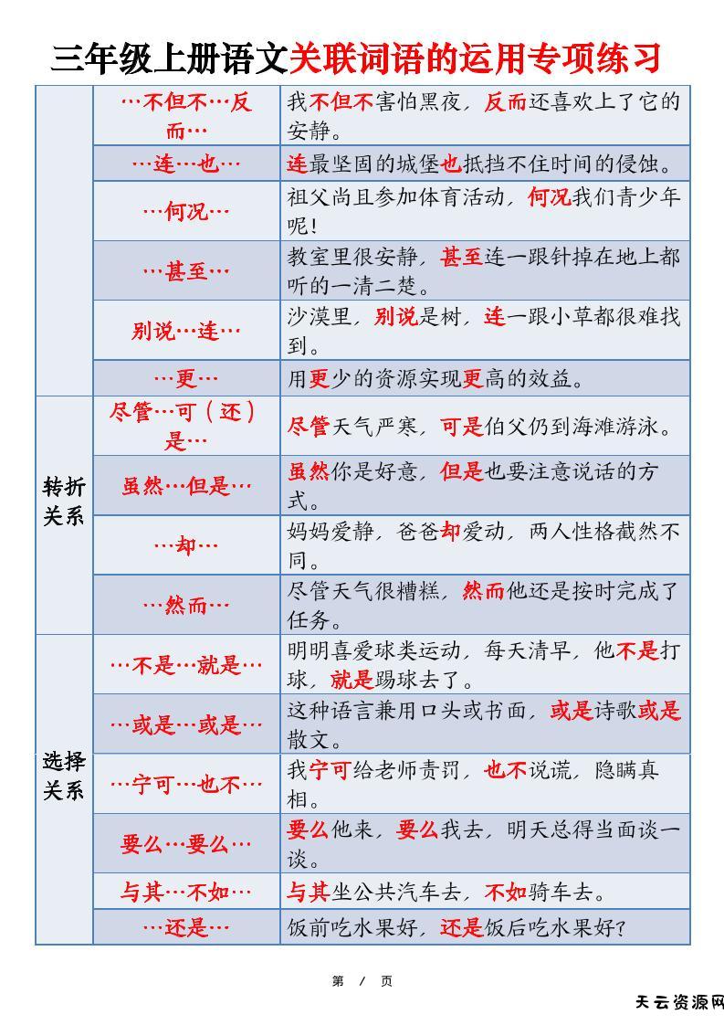 三上语文【关联词语的运用专项练习(练习+答案)22页】-天云资源网