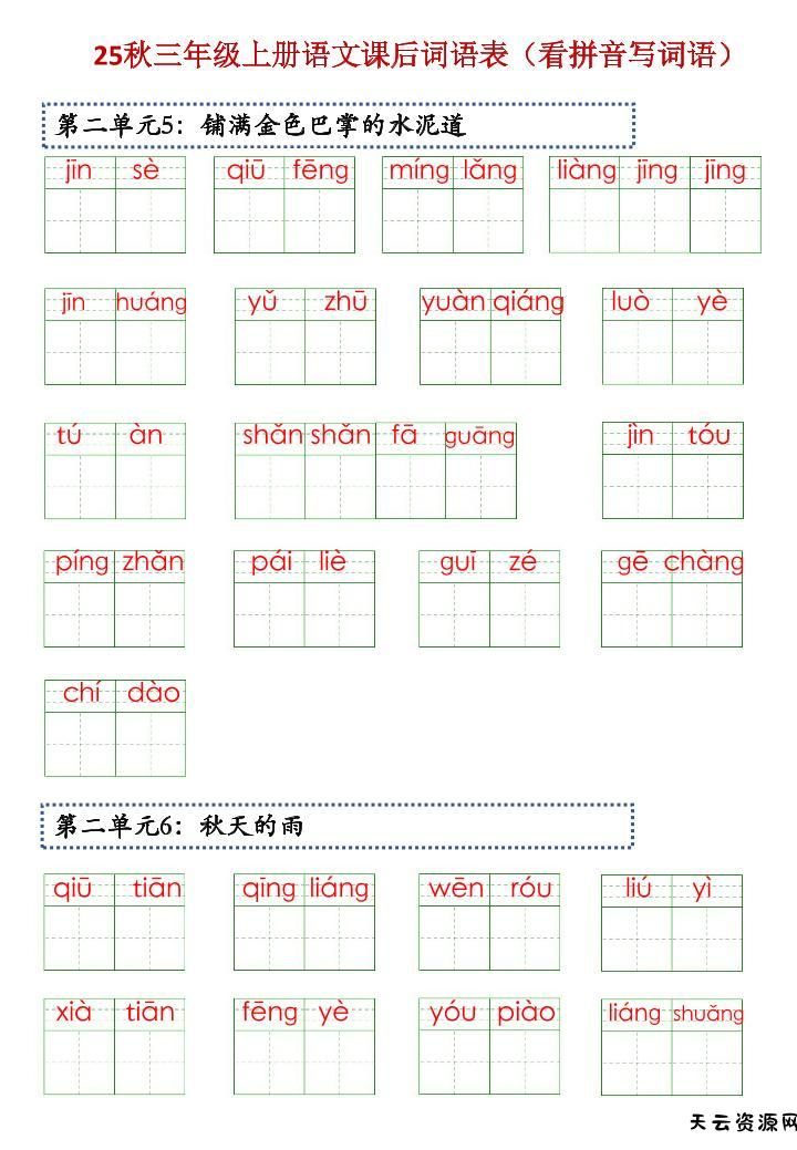 三上语文【25秋-课后词语表(看拼音写词语)】-天云资源网