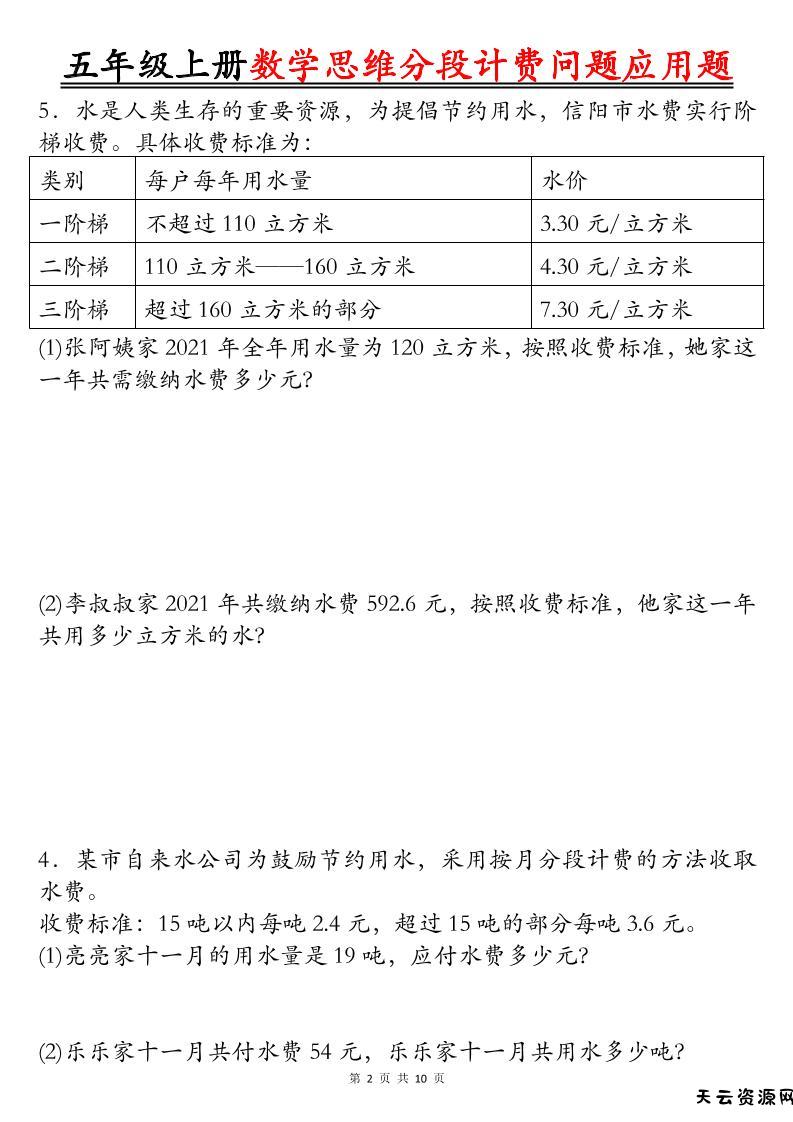 五上数学思维分段计费问题应用题空白+答案20页-天云资源网