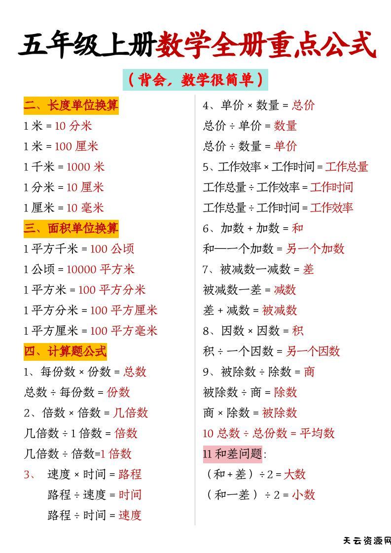 五上数学【全册重点公式】-天云资源网