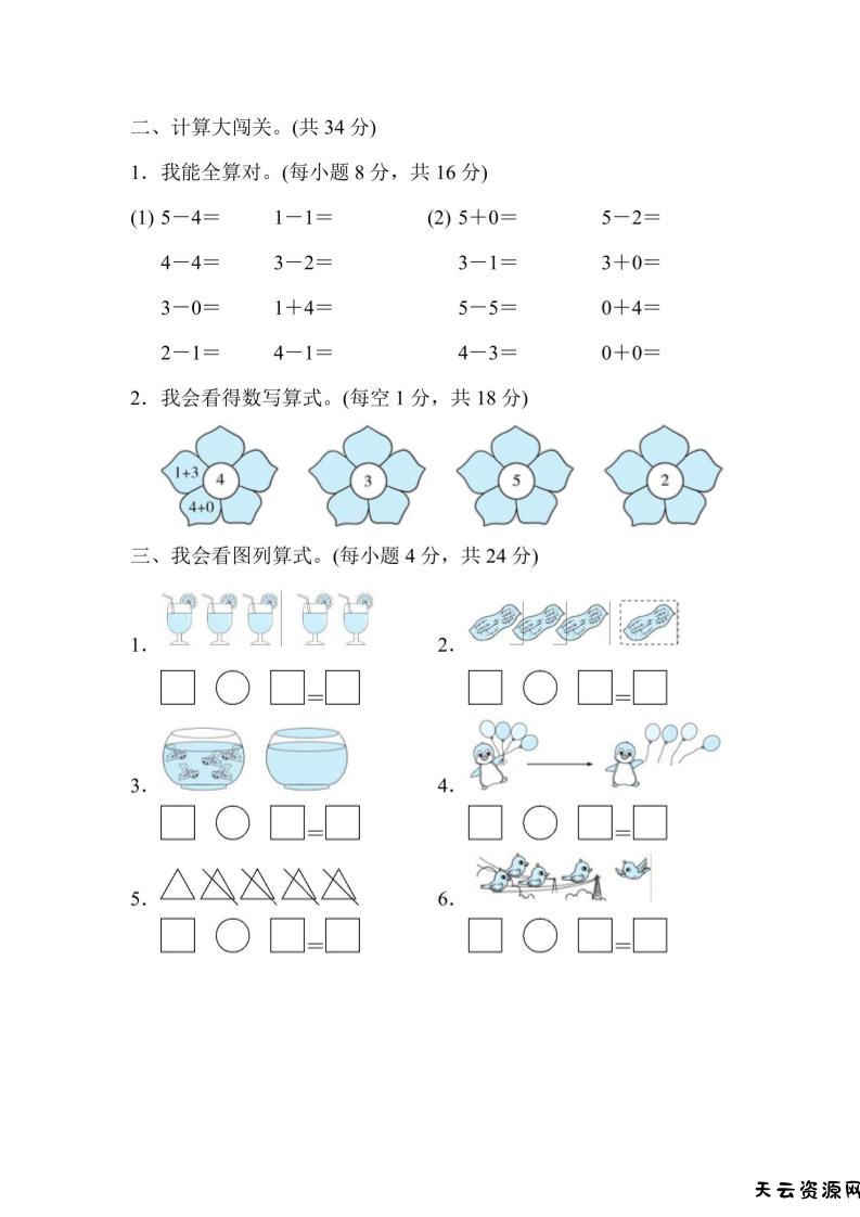 一上数学核心突破卷1~5的加减法计算及应用-天云资源网