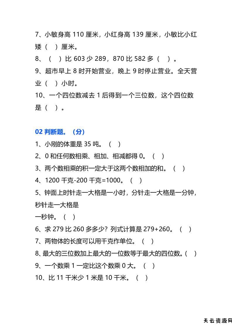 三年级数学上册易错题集锦-天云资源网