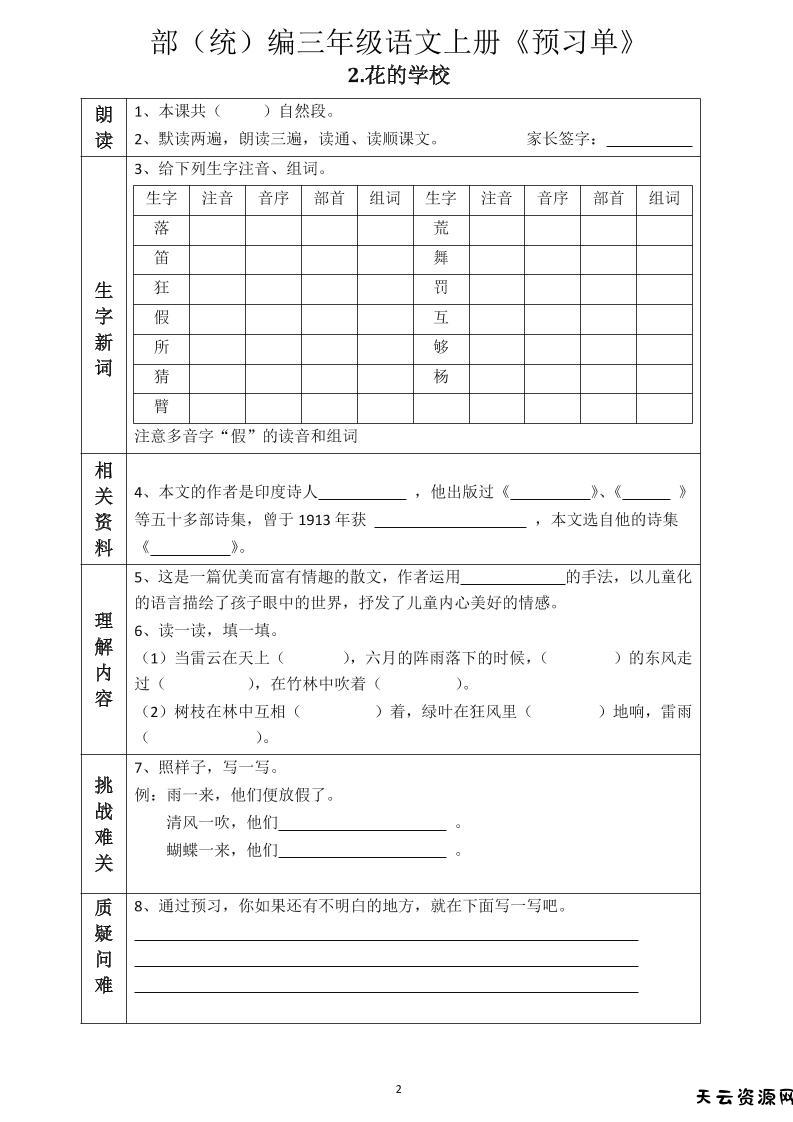 三年级语文上册《全课预习单》-天云资源网