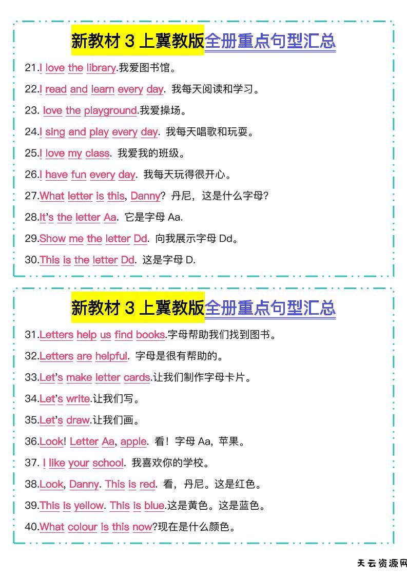 新教材三上英语冀教版全册重点句型汇总-天云资源网