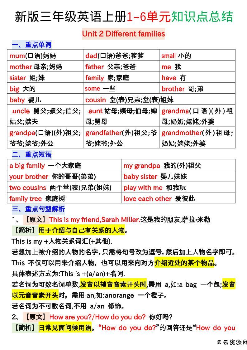 新版三年级英语上册1-6单元知识点总结-天云资源网