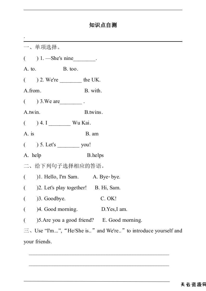 三上英语-Unit1Let'sbefriends!知识总结+练习(含答案)-天云资源网