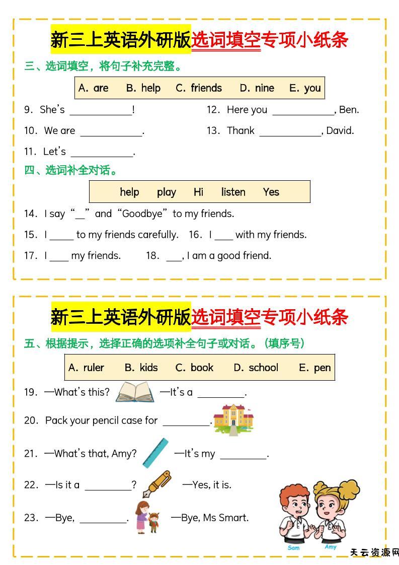 新三上英语外研版选词填空专项小纸条-天云资源网