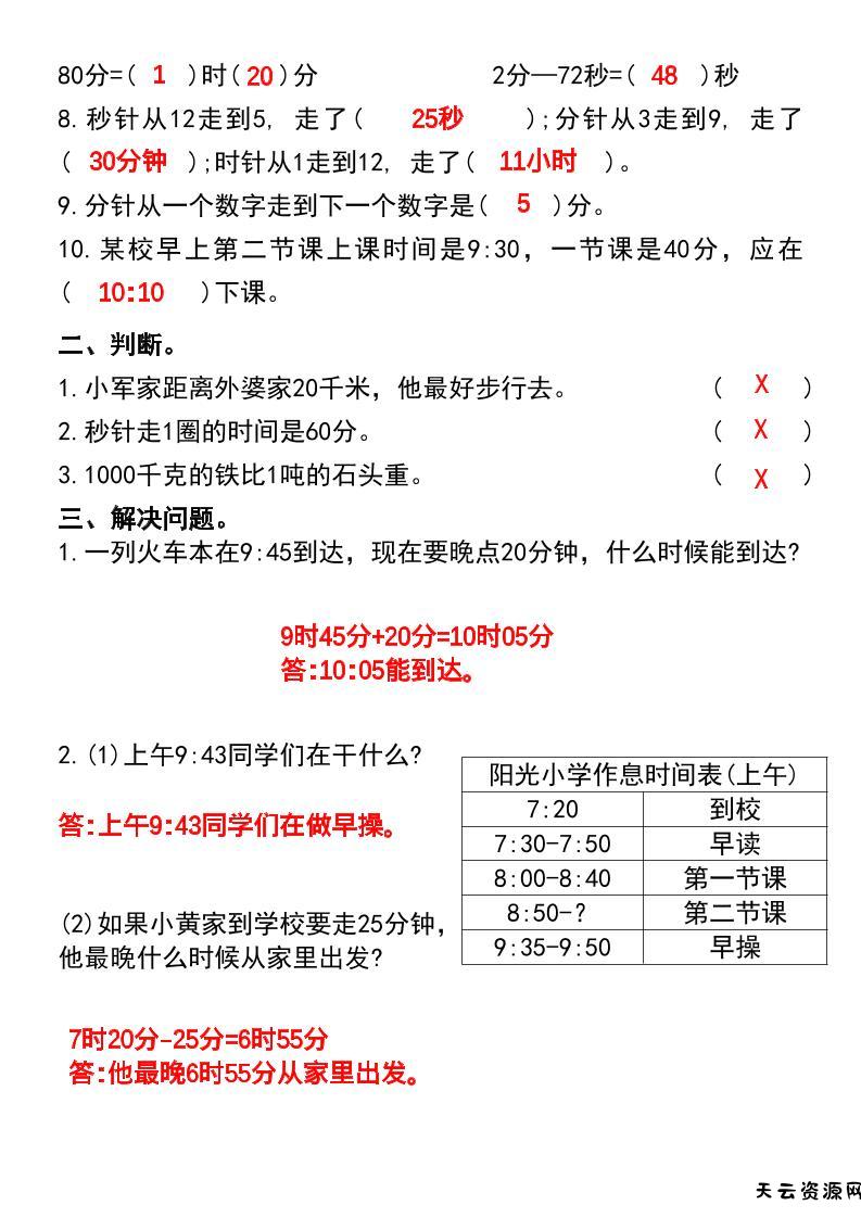 三年级上册数学期末复习•时分秒与测量专项练习卷-天云资源网
