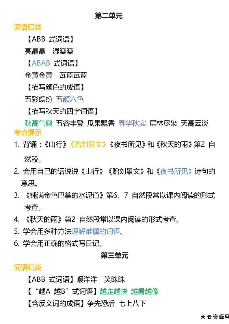 三上语文-词语归类积累课文佳句汇总-天云资源网