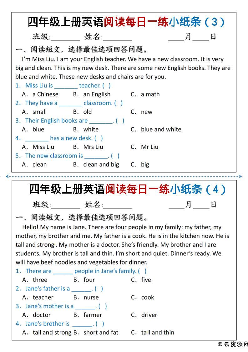 四年级上人教PEP版英语阅读每日一练小纸条-天云资源网