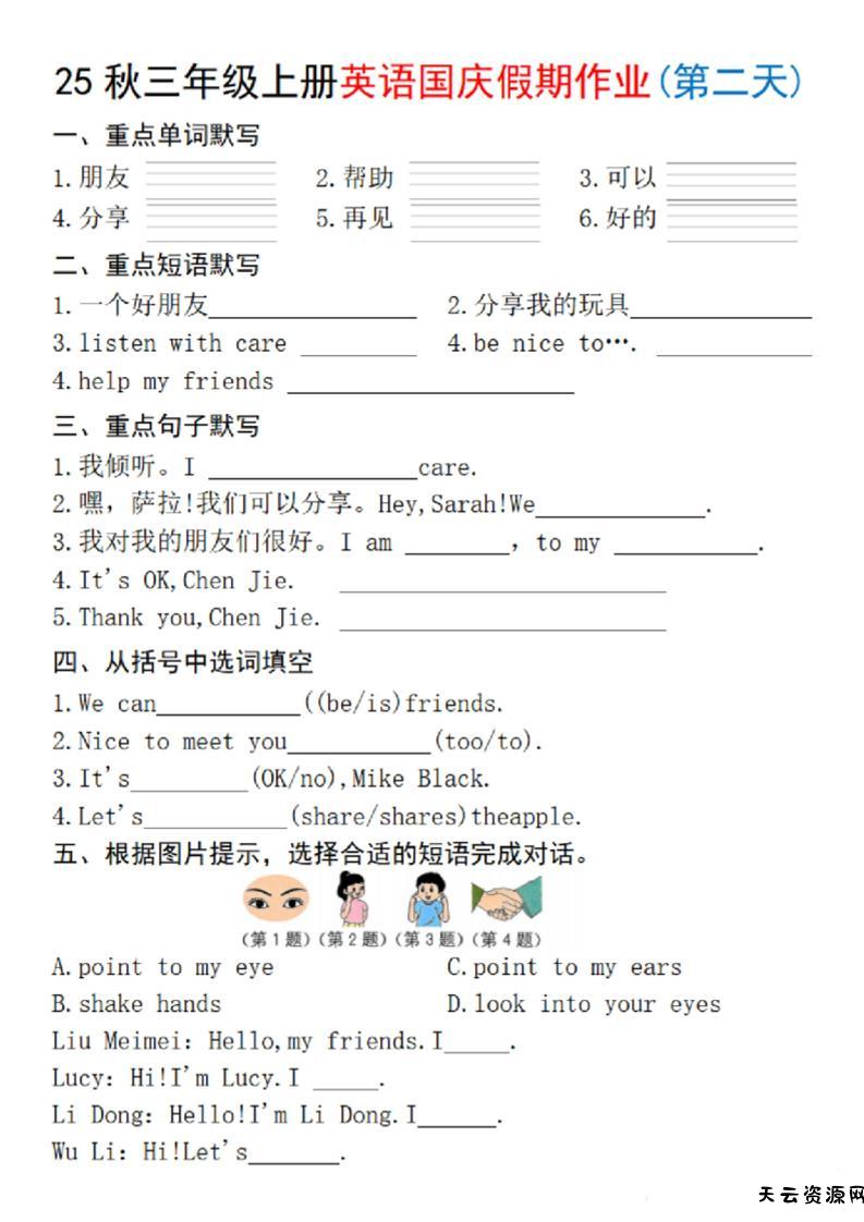 25秋三上英语国庆假期作业2-手嘴(含答案16页)-天云资源网