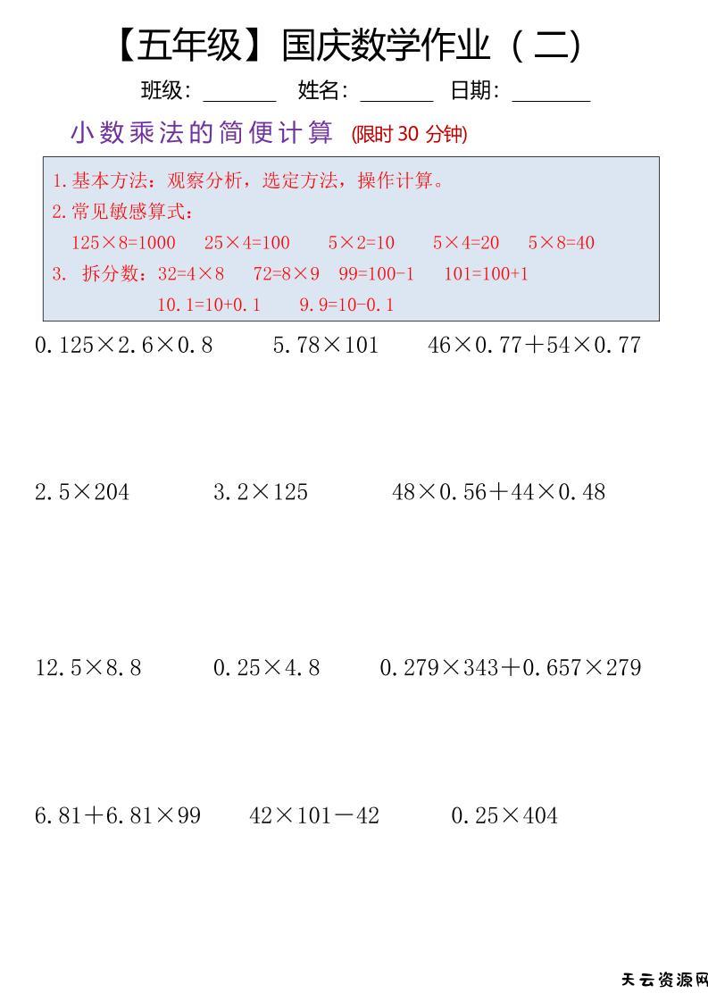 五年级数学上册国庆假期计算作业7页-天云资源网