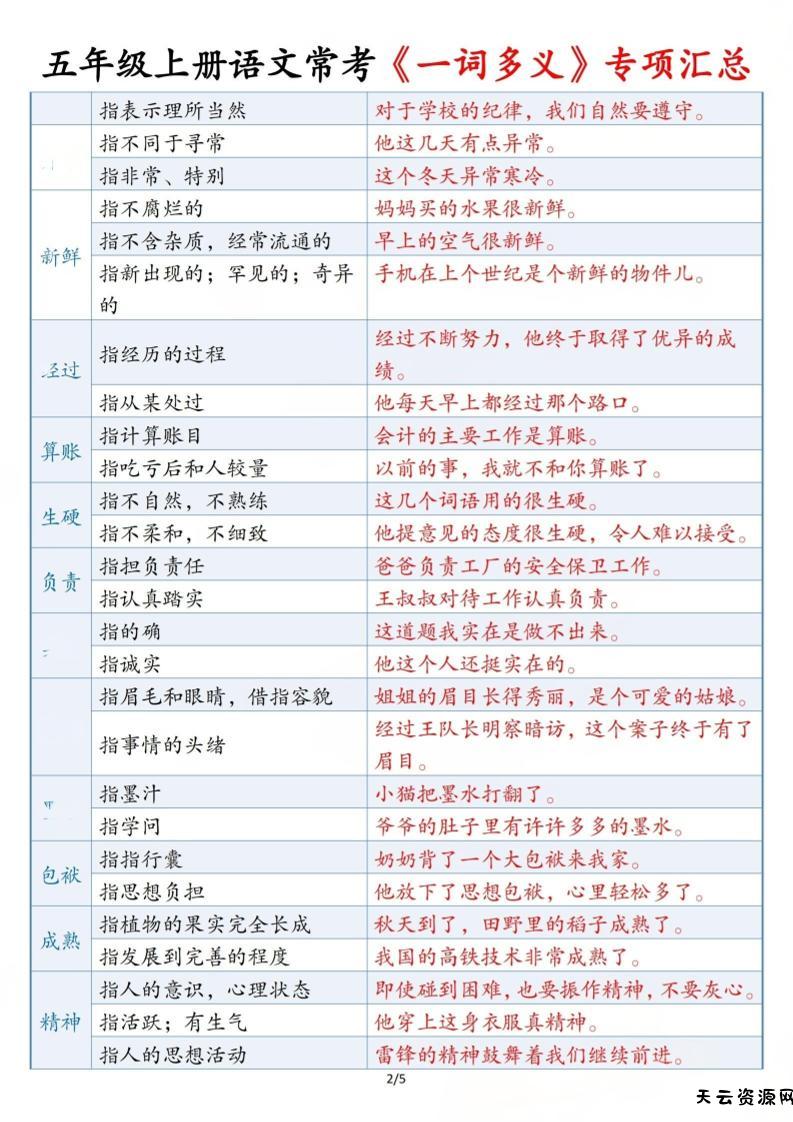五上语文常考《一词多义》专项汇总5页-天云资源网