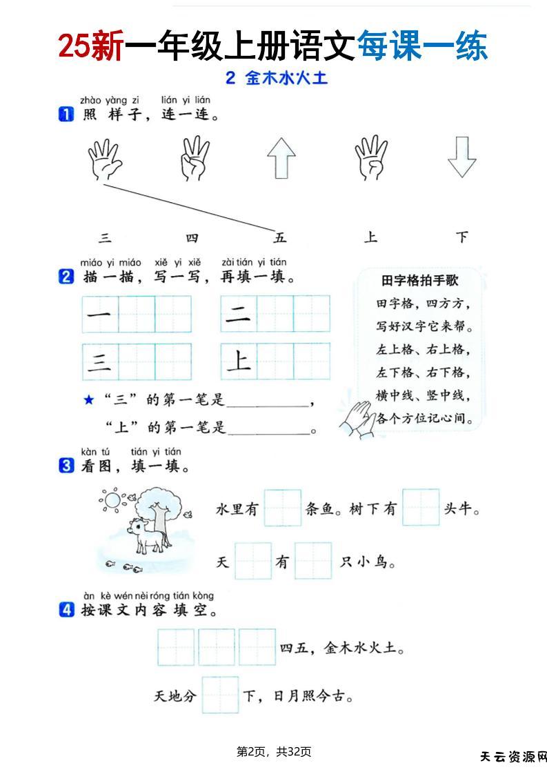 25版一上语文全册每课一练(含答案32页)-天云资源网