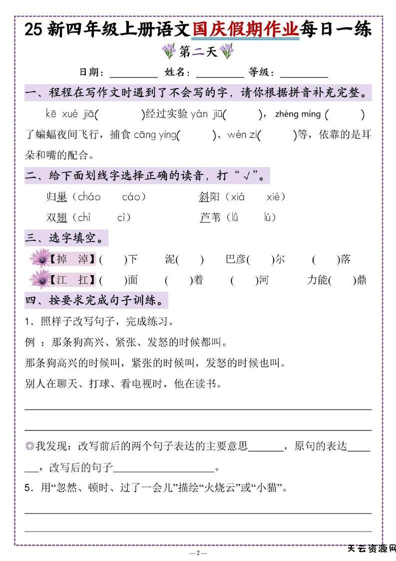 25新四上语文国庆假期作业每日一练(含答案16页)-天云资源网