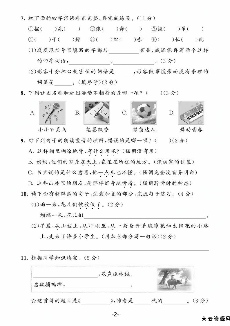 25学年三上语文第一单元达标测试卷(含答案5页)-天云资源网