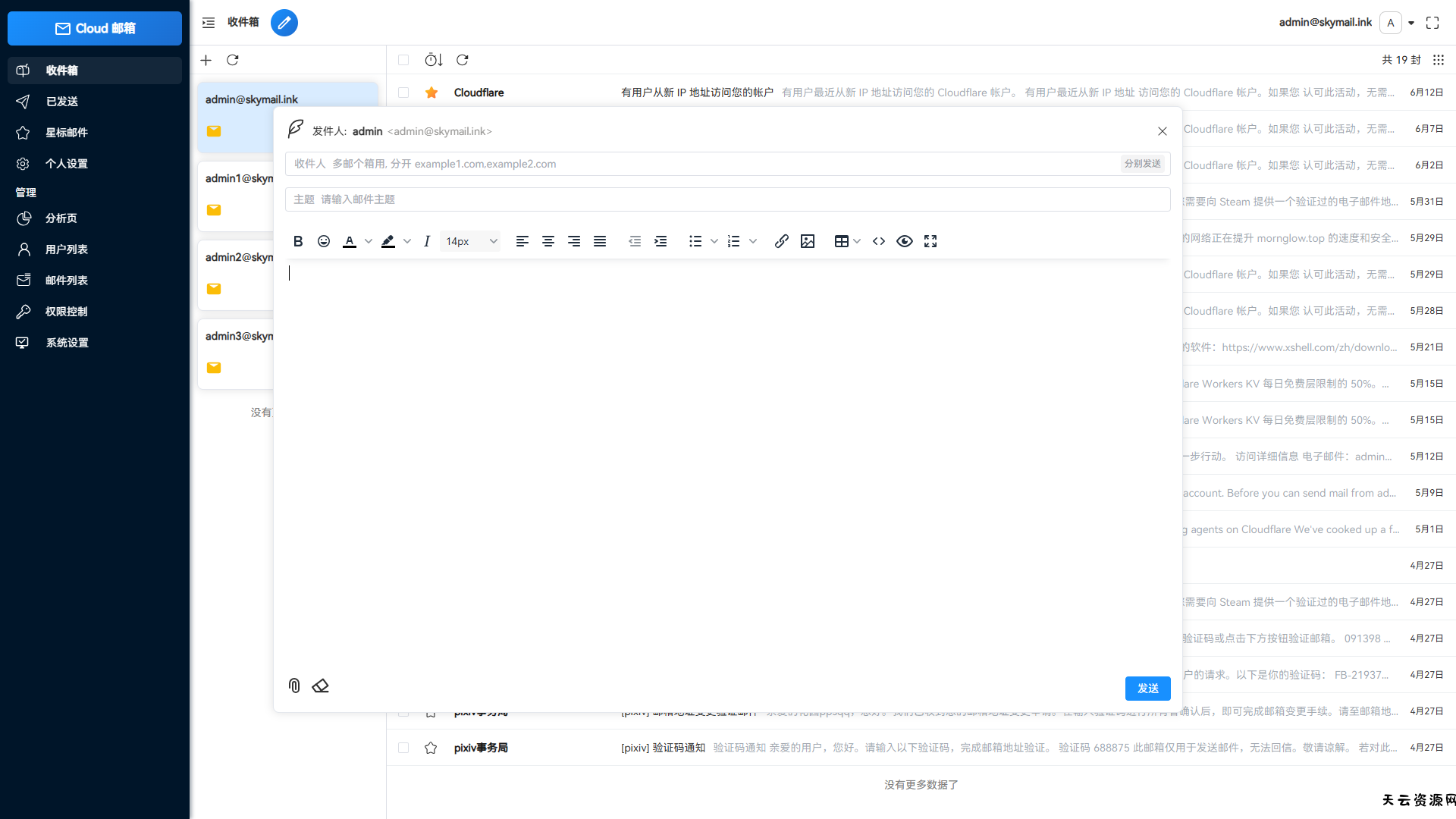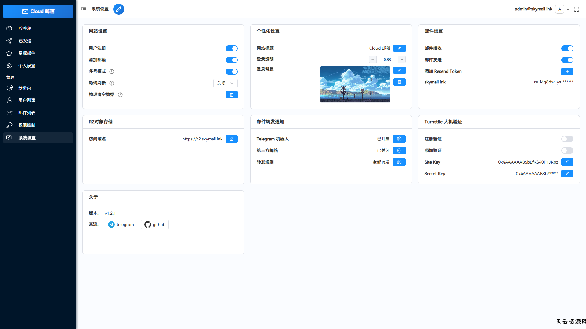 这是一款Email邮箱服务系统,并且支持邮件发送TG转发只需要一个域名,就可以创建多个不同的邮箱,类似各大邮箱平台 QQ邮箱,谷歌邮箱等,本项目使用Cloudflare部署,Resend推送邮件,无需服务器费用,搭建自己的邮箱服务。