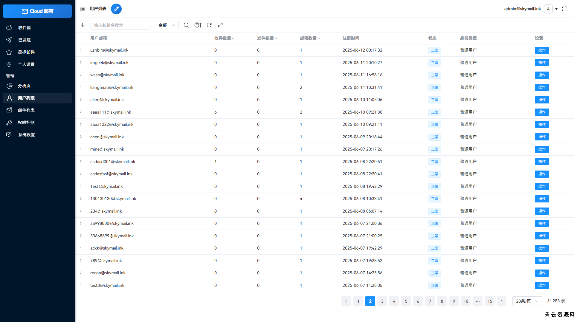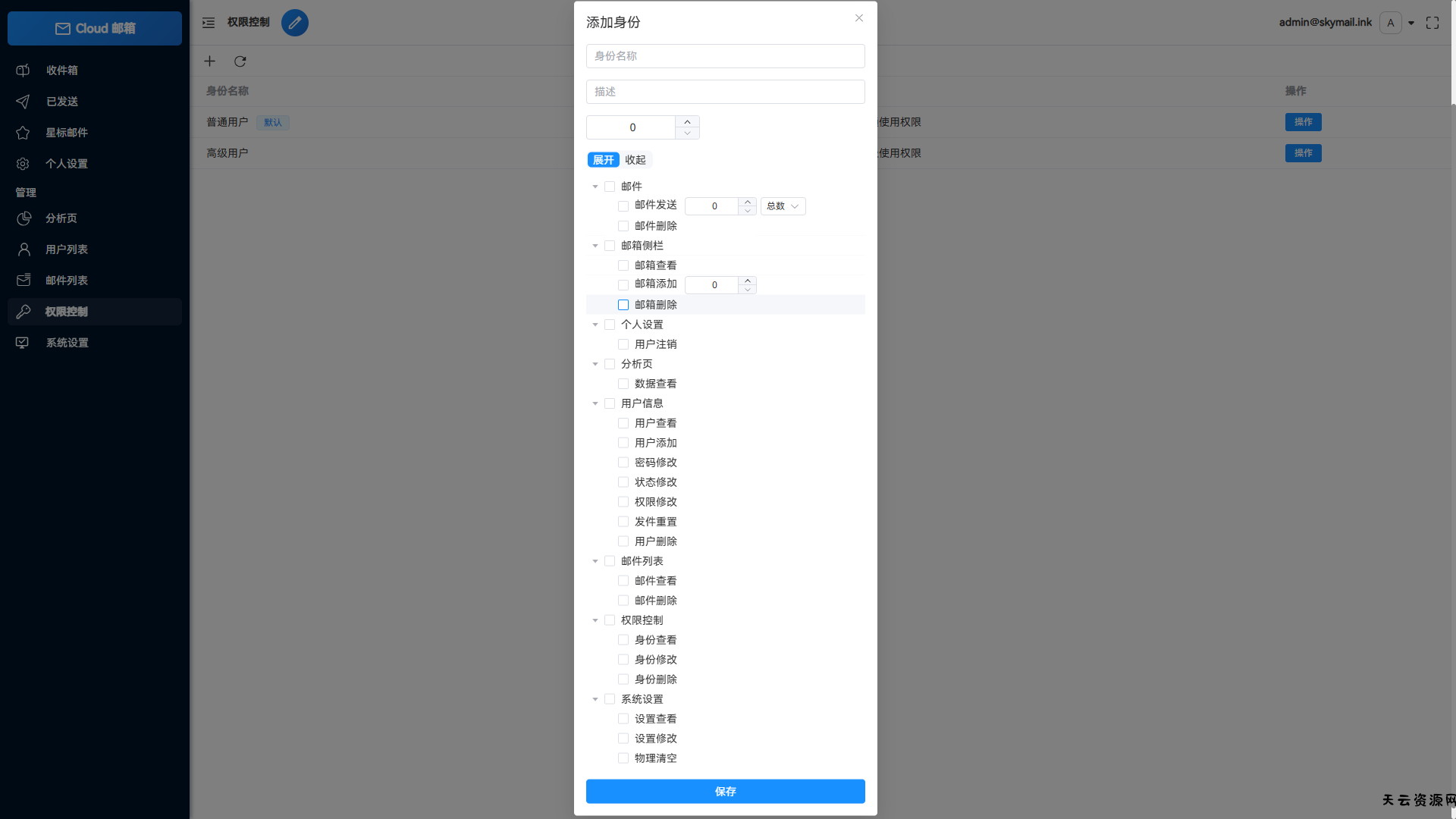 管理员功能:可以对用户,邮件进行管理,RABC权限控制对功能及使用资源限制