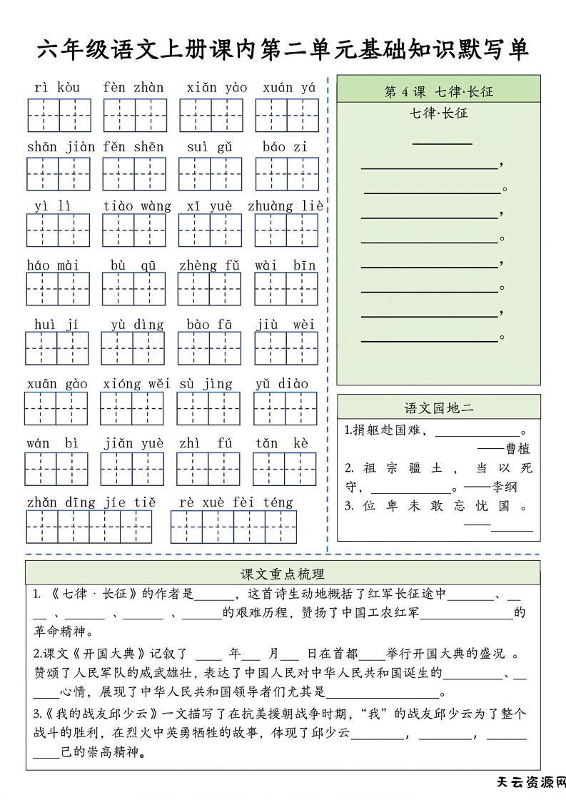六上语文基础知识默写单(1-8单元)含答案16页-天云资源网