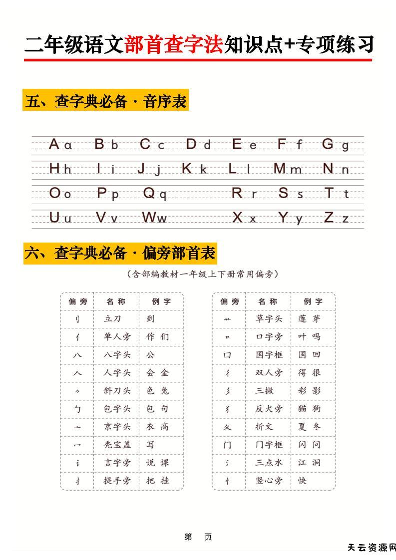 二年级语文上册部首查字法知识点+专项练习6页-天云资源网