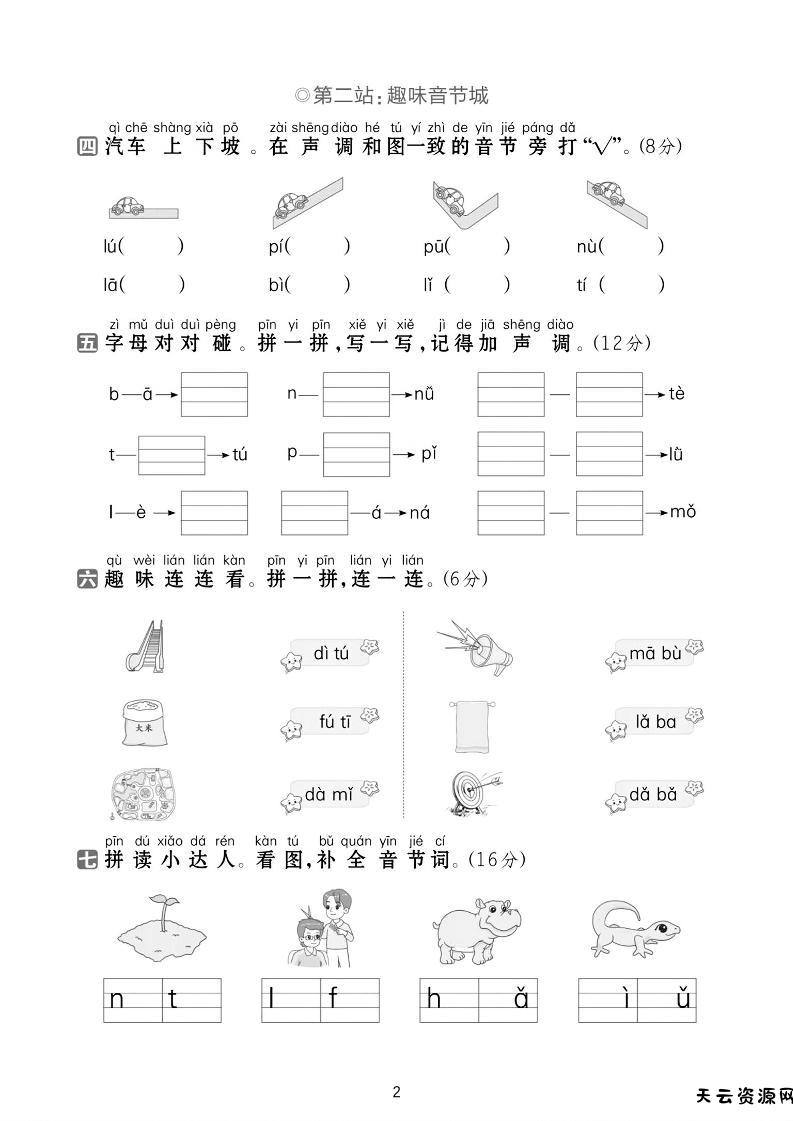 25学年一上语文第二单元达标检测卷-字母游乐园(含答案5页)-天云资源网