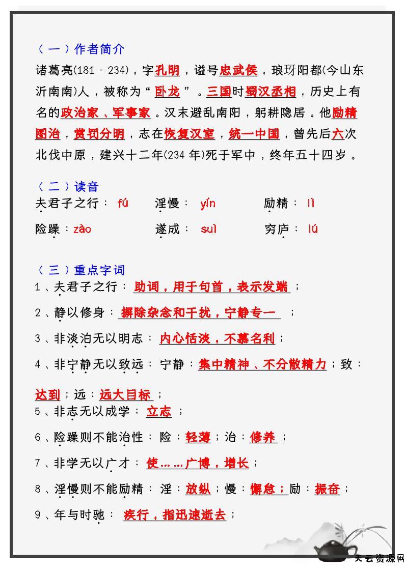 【2025秋新版】教材_七年级语文上册必考课文:《诫子书》知识点考点笔记-天云资源网