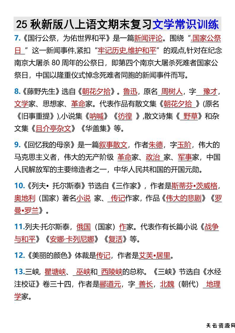 【2025秋新版】八上语文期末复习文学常识训练-天云资源网