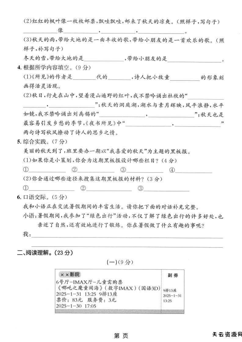 新三上语文第一次月考拔尖测试卷(含答案5页)-天云资源网
