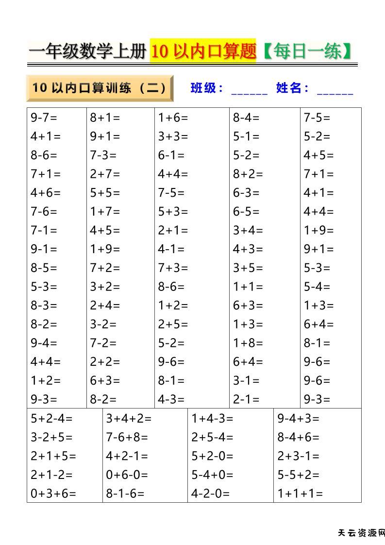 新一上数学10以内口算题【每日一练】8页-天云资源网