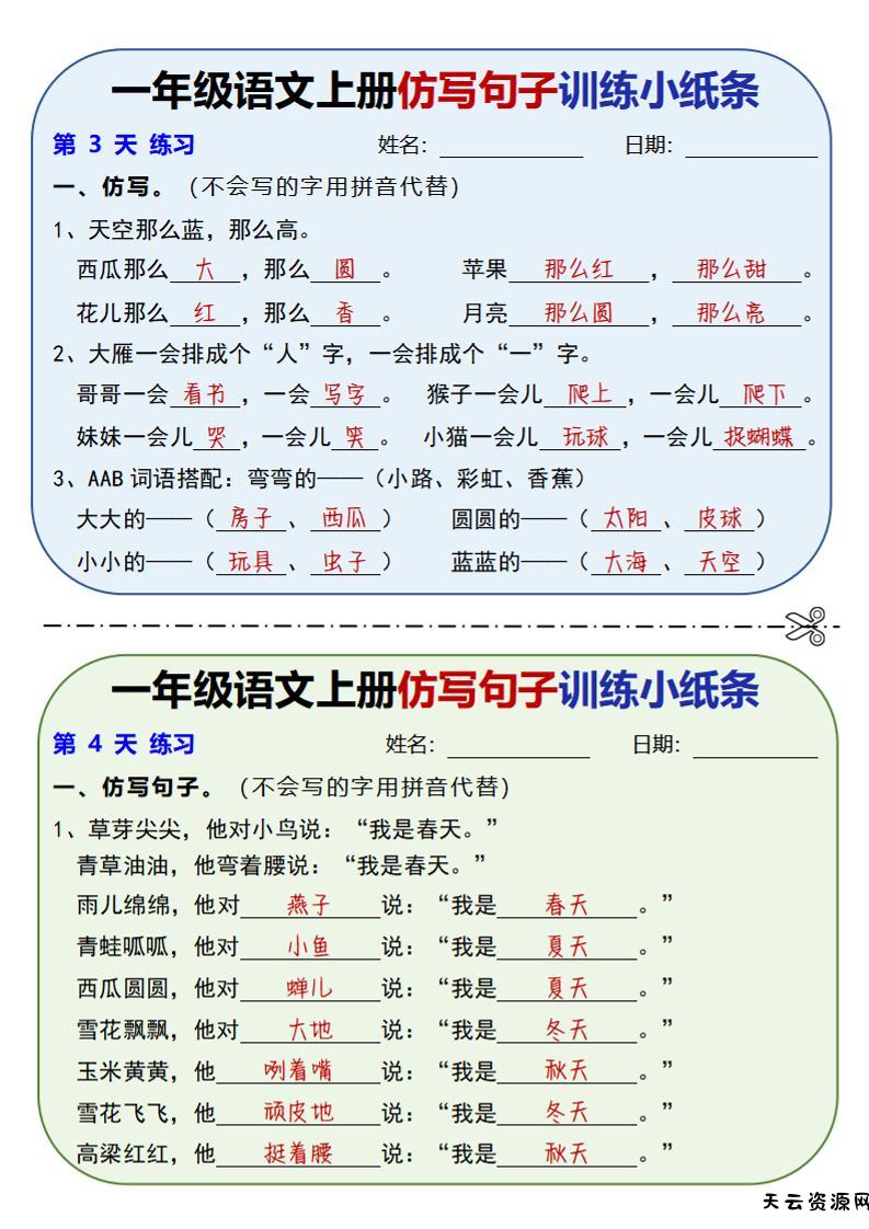 新一上语文仿写句子训练小纸条(含答案10页)-天云资源网