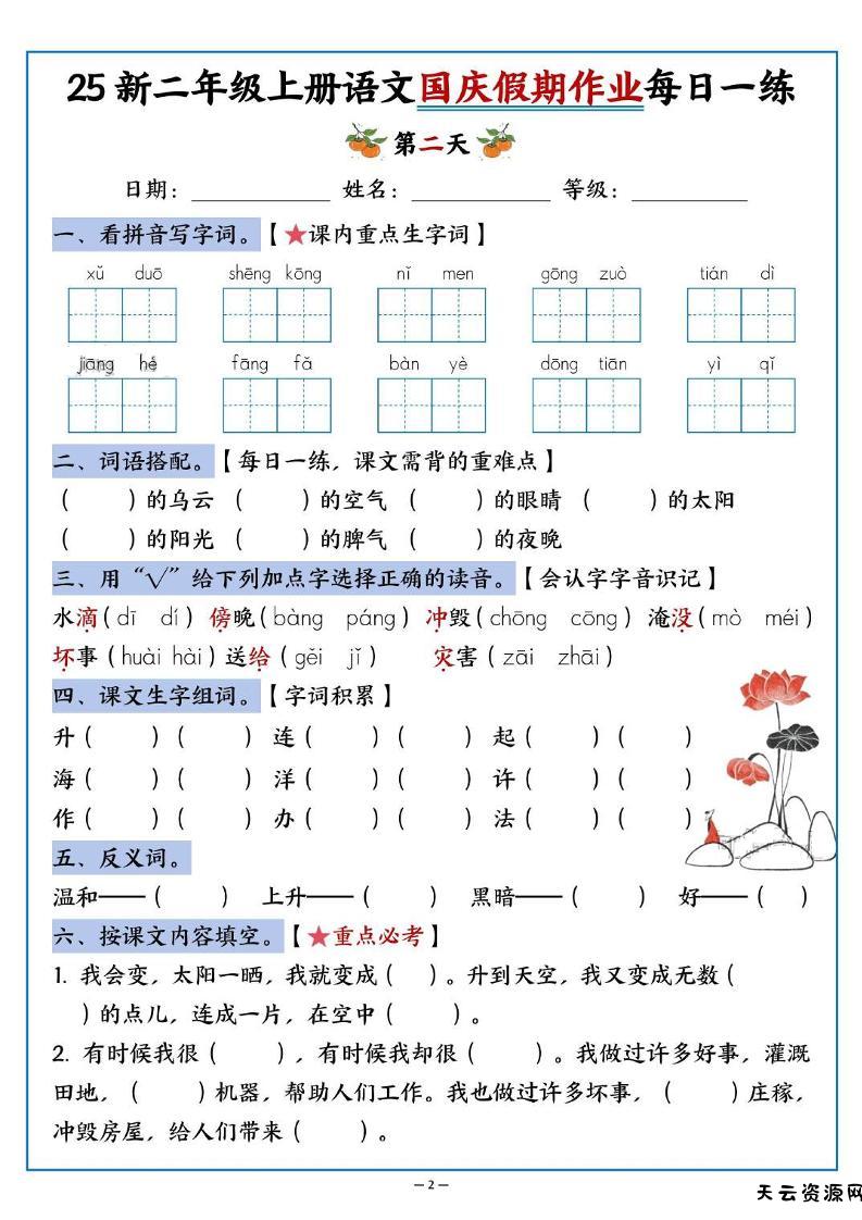 25新二上语文国庆假期作业每日一练(含答案16页)-天云资源网